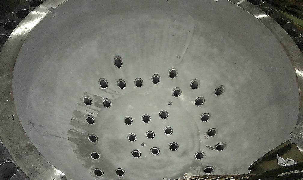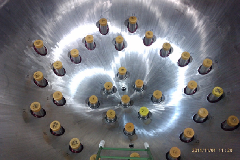 Ispitivanje bez razaranja tekućim penetrantima unutarnje površine glave reaktorske posude. Ispitivanje provedeno nakon nanošenja navarene obloge i toplinske obrade